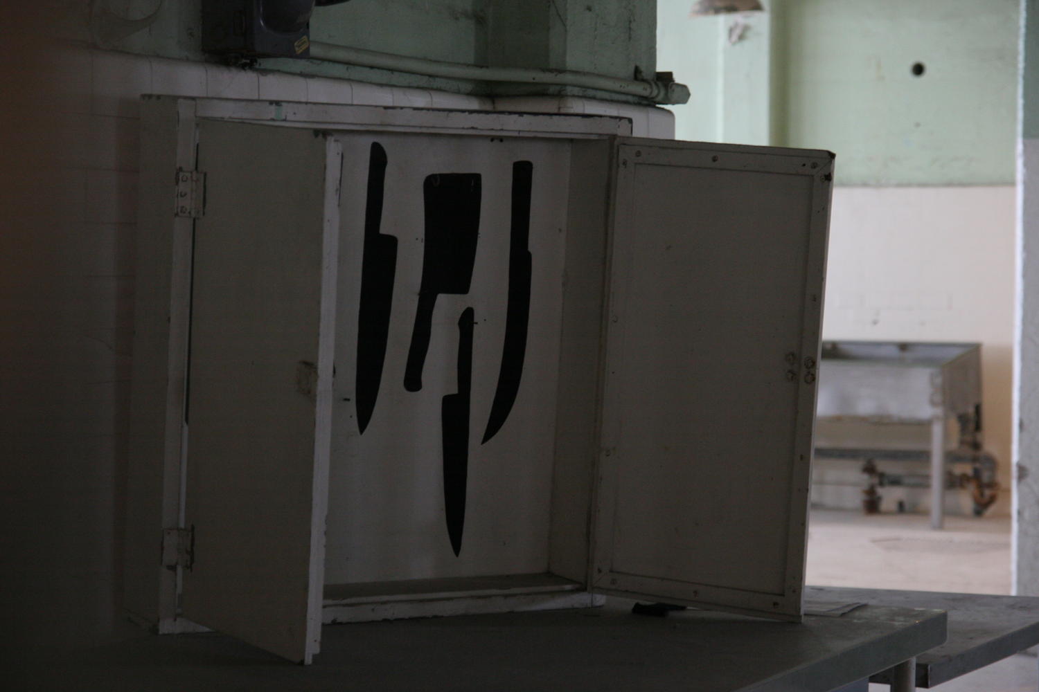 Sicherheitsmaßnahme: alle Werkzeuge sind als Schatten im Schrank aufgemalt. So können Wachen von außen
