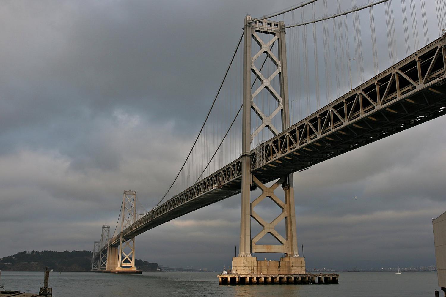 Kurz vor Sonnenuntergang riss der Himmel noch auf und beleuchtete die Bay Bridge etwas schöner. Faszinierend an dieser Brücke ist übrigens die Tatsache, dass sie zweistöckig ist: unten gehen 5 Spuren hin zur Insel, oben zurück.