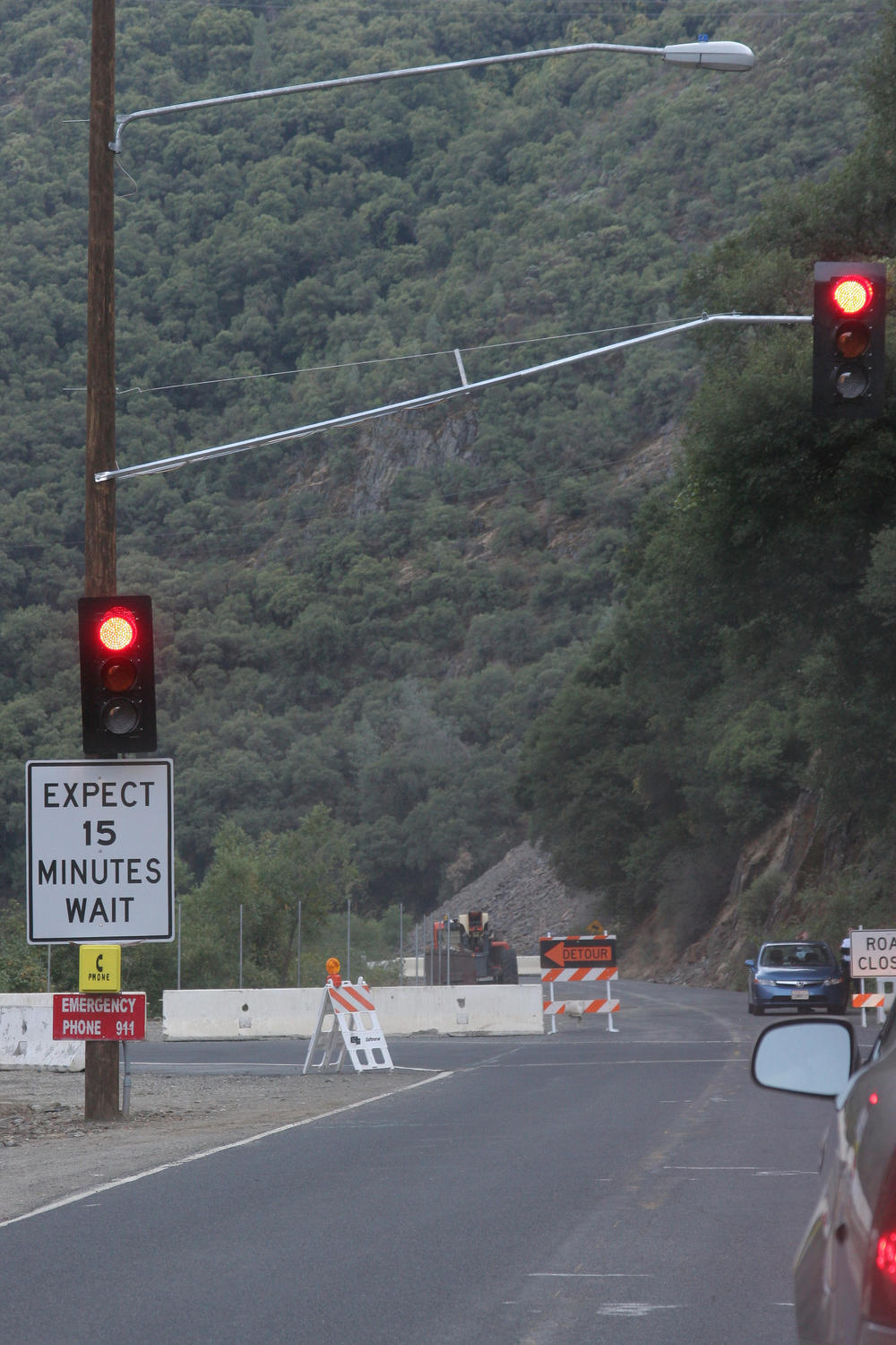 kompletten Highway blockiert. Eine Umleitung führt auf der anderen Seite des Merced River - auf der