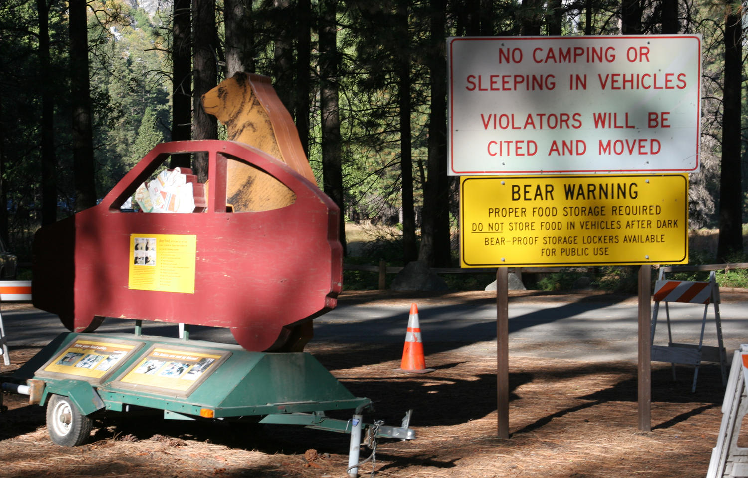 Im Gebiet des Yosemite National Parks sind viele Bären unterwegs, die durchaus auch Autos aufbrechen, wenn es darin nach etwas leckerem riecht. Deswegen steht am Parkplatz eine entsprechende Warnung, (