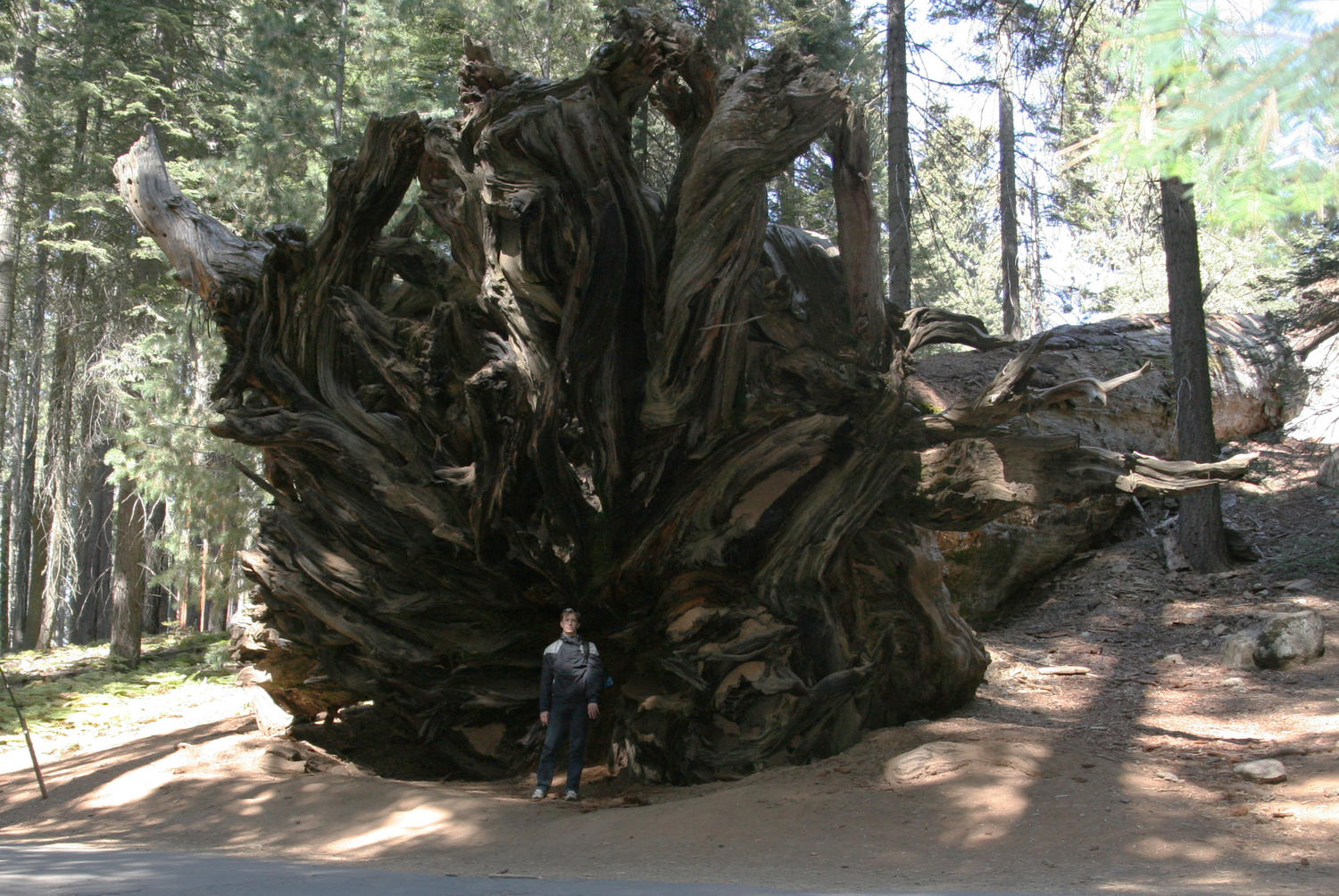 Als dieser Sequoia fiel, war er etwa 2500 Jahre alt. Das Umfallen ist auch so ziemlich das einzige, was diese Riesen umbringt - halten die Wurzeln auf dem Untergrund nicht mehr (z.b. wegen klimatischer Veränderungen), dann stürzen die Riesen um und geben aus ihren Gefäßen eine Unmenge an Wasser frei.
