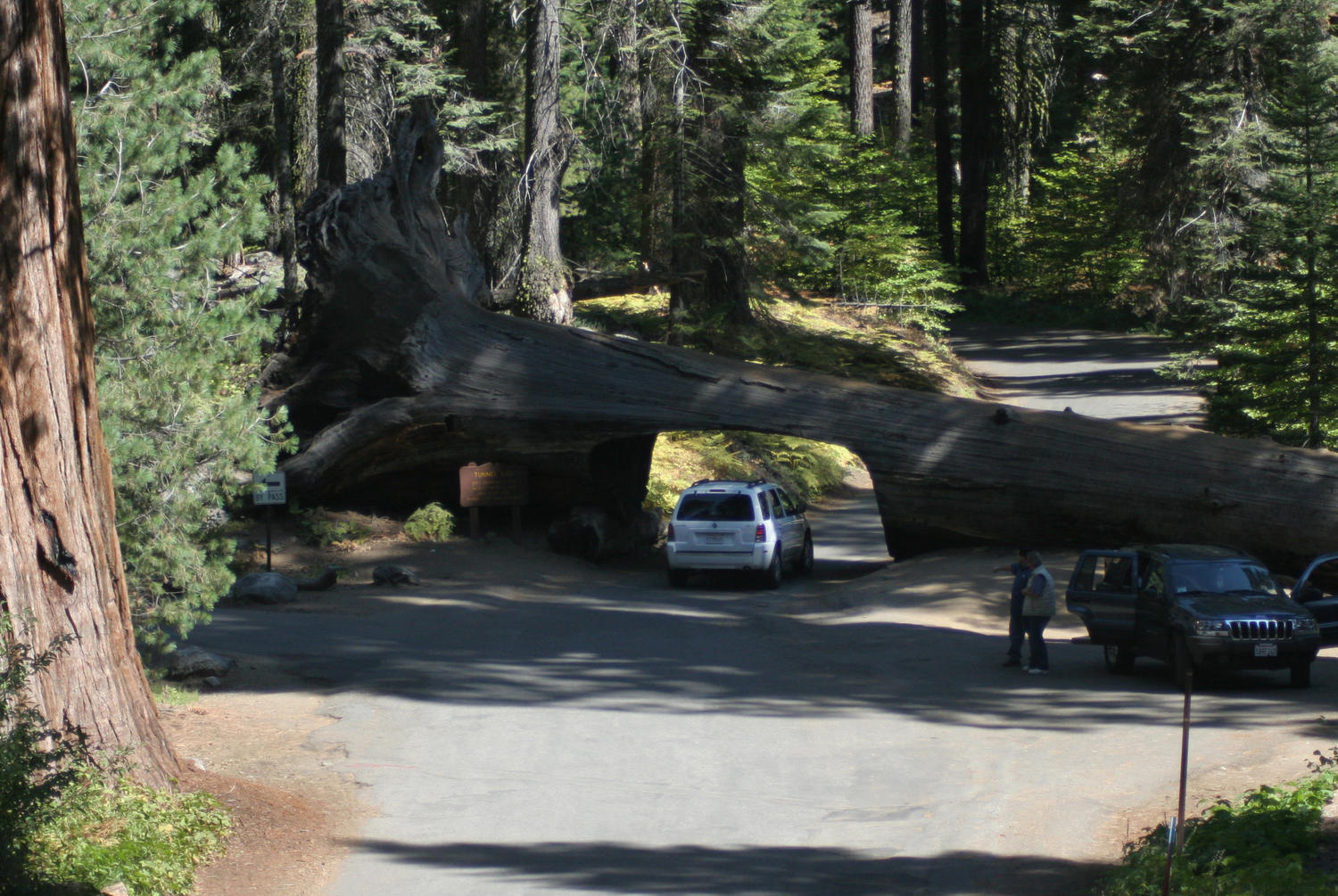 Der Einfachheit halber hat man es sich hier erspart, den gefallenen Sequoia beiseitezuräumen. Die Durchfahrt ist knapp über 5 Meter breit und 2,4 Meter hoch.